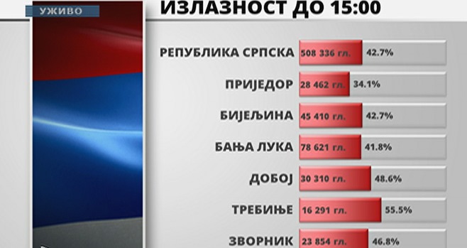 16.40 – Do 15 časova u Šamcu je glasalo 6. 464 ili 41,37 odsto glasača, u Srebrenici 5.164 ili 49,37 odsto glasača, u Stanarima 4.164 ili 57,89 odsto glasača, u Krupi na Uni 849 ili 47,61 odsto glasača, u Bijeljini 42,67 odsto, u Loparama 6.072 ili 48,87 odsto glasača, u Višegradu 5.419 ili 50,71 odsto glasača, u Istočnom Sarajevu 19.871 ili 51,71 odsto glasača, u Čajniču 2.183 birača ili 52,36 odsto, u Bratuncu 7.923 birača ili 50,40 odsto, u opštini Sokolac 5.935 birača ili 54,5 odsto, Han Pijesku do 1.924 glasača ili 58,41 odsto.