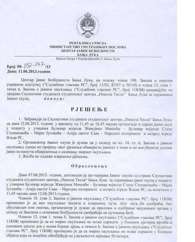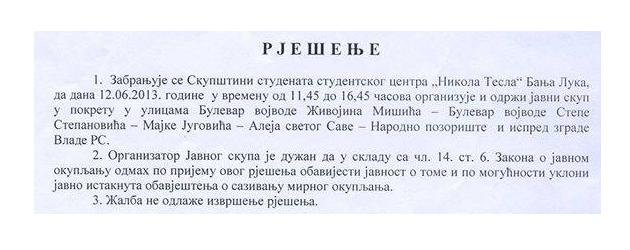 CJB Banjaluka u rješenju navodi da se 12. jula od 11:45 do 16:45 časova zabranjuje skup u pokretu banjalučkim ulicama na relaciji: bulevar Vojvode Živojina Mišića, Bulevar vojvode Stepe Stepanovića – Majke Jugovića -Aleja svetog Save – Narodno pozorište RS i plato ispred zgrade Vlade RS.