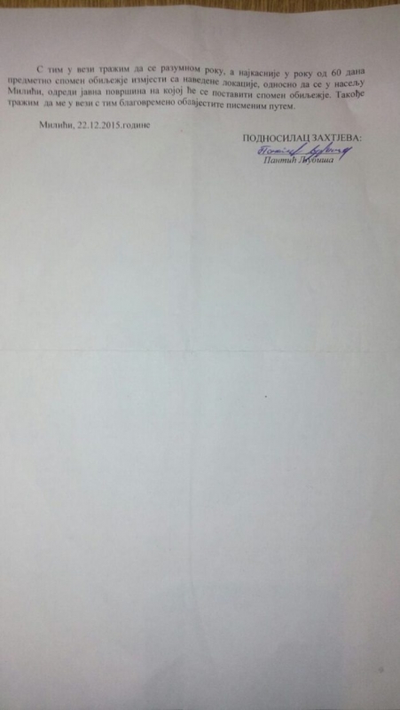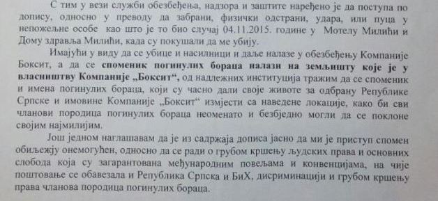 Pantić u ovom dopisu ističe i da zabrana pristupa spomen obilježju predstavlja grubo kršenje ljudskih prava i osnovnih sloboda koje su zagarantovane međunarodnim poveljama i konvencijama.