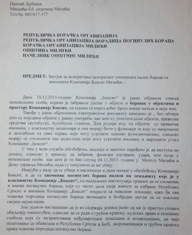 Razlog za to je, kako se navodi u zahtjevu, spisak nepoželjnih osoba kojima je zabranjen pristup svim objektima i lokacijama koji su u vlasništvu kompanije "Boksit".