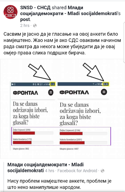 Zanimljivo je da su analizu ove Frontalove ankete napravili i mladi botovi SNSD-a, koji su vrlo vjerovatno dobili „po ušima“ od svojih stranačkih šefova zbog poraza u anketi.