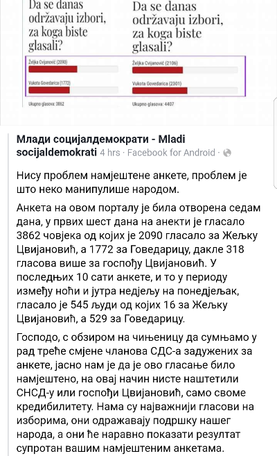 Frontalova anketa „Da se danas održavaju izbori, za koga biste glasali?“, oborila je dosadašnje rekorde po broju glasova, što implicira da je svima jasno da su se u glasanje uključili stranački plaćenici tzv. botovi, kako SDS-a tako i SNSD-a.