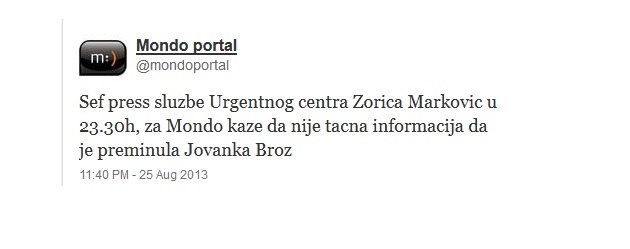 Sef press sluzbe Urgentnog centra Zorica Markovic u 23.30h, za Mondo kaze da nije tacna informacija da je preminula Jovanka Broz