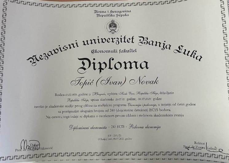 Nadalje, 13. jula 2021. prikriveni istražitelj kodnog imena „Sandi“ je na području Banja Luke ostvario neposedni kontakt sa osumnjičenim Dušanom Perićem od kojeg je preuzeo diplomu izdatu od strane NUBL-a, a na ime prikrivenog istražitelja Novaka Topića, kojom je ovaj stekao zvanje diplomirani ekonomista sa 240 ECTS bodova.