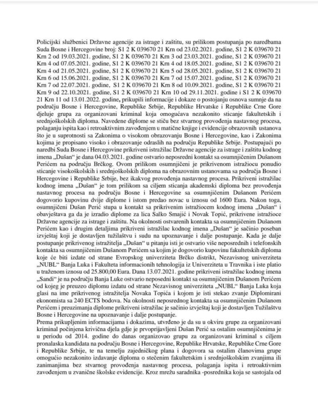 Prema prikupljenim informacijama i dokazima, utvrđeno je da su u okviru grupe za organizovani kriminal počinjena krivična djela tako što je prvoprijavljeni Dušan Perić s ostalim osumnjičenim u periodu od 2014. do danas organizovao kriminalnu grupu s ciljem pronalaska kandidata na području BiH, Hrvatske, Crne Gore i Srbije, te na temelju zajedničkog plana i dogovora s ostalim članovima grupe omogućio nezakonito izdavanje diploma o stečenim fakultetskim i srednjoškolskim zvanjima ili zanimanjima bez stvarnog provođenja nastavnog procesa, polaganja ispita i retroaktivnim zavođenjem u zvanične školske evidencije.