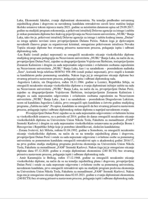 Prvoprijavljeni i danas uhapšeni Dušan Perić, drugoprijavljeni i također uhapšeni Vojislav Škrbić te trećeprijavljeni Zoran Kalinić (inače rektor NUBL-a, koji je u Srbiji i zasad nedostupan organima gonjenja), su u periodu od 2018. do danas omogućili nezakonito sticanje visokoškolskih diploma na NUBL-u za više osoba, između ostalih i Marini Kiković, iz mjesta Sjenica, Republika Srbija (1992. godište) na za sada neutvrđenom studijskom programu.