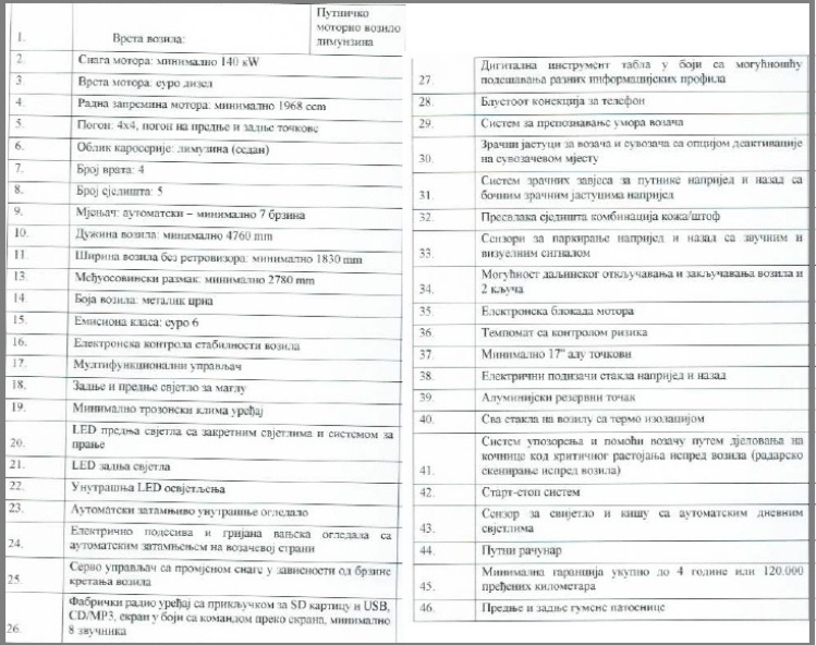 Precizirano je i da vozilo ne smije da bude kraće od 4,76 metara, da mora da bude metalik crno, a pored digitalne instrument table u boji i sistema za prepoznavanje umora, definisano je i da radio/cd plejer ima osam zvučnika.