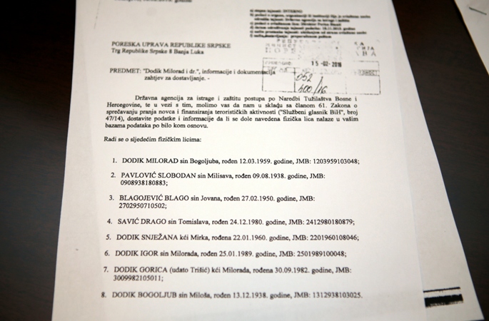 Dodik je rekao da postoje konkretne stvari koje se provode i da je protiv njegove porodice pokrenuta široka vrsta istrage u mnogim institucijama u RS-u pa čak i regionu. On je tvrdi da je napravljen spisak, po nalogu Tužilaštva BiH, u okviru kojeg SIPA traži podatke o Miloradu Dodiku, Snježani Dodik, Igoru Dodiku, Gorici Dodik i Bogoljubu Dodiku.