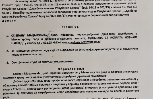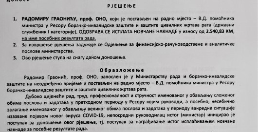 “Duboko cijeneći rad, trud, profesionalnost, stručnost i nesebično zalaganje imenovanih u obavljanju velikog obima poslova i zadataka u periodu vanredne situacije izazvane pojavom novog virusa COVID-19, ministar je inicirao donošenje ovog rješenja odnosno postupka za nagrađivanje isplaćivanjem novćane naknade za posebne rezultate rada”, stoji u Rješenjima koje potpisuje ministar Milunović.