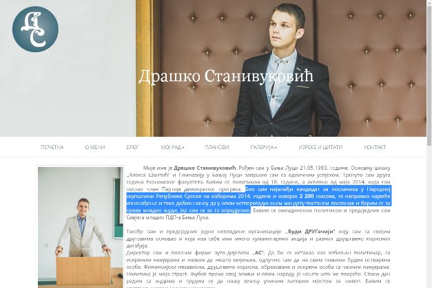 "Bio sam najmlađi kandidat za poslanika u Narodnoj skupštini Republike Srpske na izborima 2014. godine i osvojio 2 200 glasova, te napravio najveće iznenađenje i tako dobio šansu da u ovom četverogodišnjem mandatu postanem poslanik i borim se za prava mladih ljudi, jer sam se za to opredjelio", stoji na zvaničnom sajtu Stanivukovića.