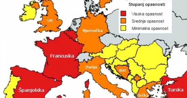 Zona sa srednjim stepenom rizika od napada (narandžasta boja) na turiste uključuje Njemačku, Italiju i Grčku, Maroko, Švedsku ali i BiH. Ali i u tim zemljama je moguć napad na turiste iz Velike Britanije zbog konflikata u Iraku i Siriji.