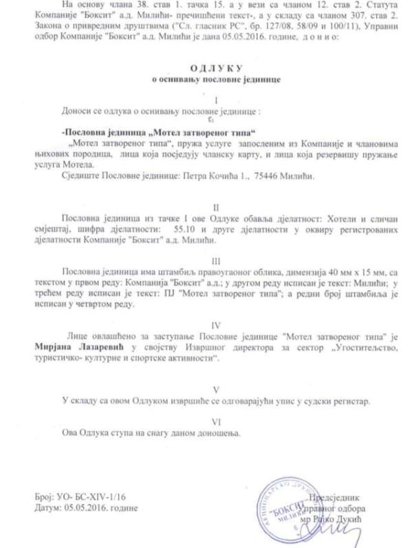 Poslovnu jedinicu "Motel zatvorenog tipa" će zastupati Mirjana Lazarević i to u svojstvu Izvršnog direktora za ugostiteljstvo.