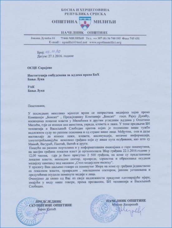 Samo dva dana ranije, načelnik opštine Milići Momir Lazarević obratio se OSCE-u, Ombudsmanu za ljudska prava BiH i Regulatornoj agenciji za komunikacije od kojih je tražio da prema BN-u i Vasiljević Slobodanu, preduzmu odgovarajuće mjere u okviru svojih nadležnosti. Razlozi obraćanja identični su kao i razlozi obraćanja kompanije “Boksit”.