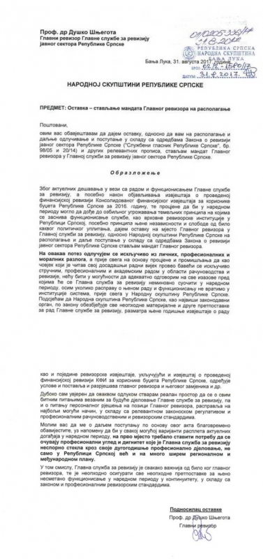 Napomenuo je da bi u svakoj mogućoj varijanti raspleta aktuelnih događaja u narednom periodu, na prvom mjestu trebalo imati potrebu da se očuvaju profesionalni ugled i dignitet koje je Glavna služba za reviziju nesporno stekla kroz svoje dugogodišnje profesionalno djelovanje, ne samo u Republici Srpskoj već i na mnogo širem regionalnom i međunarodnom planu.