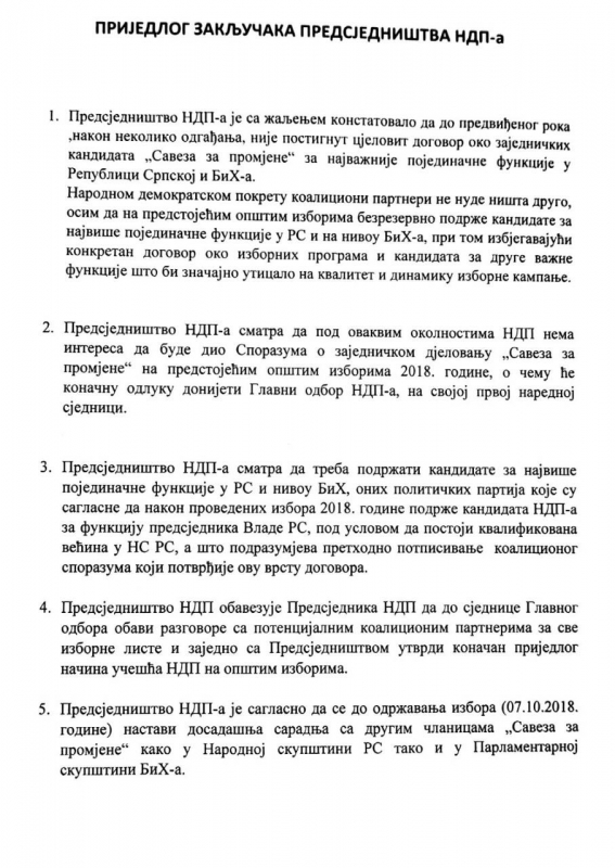 "Predsjedništvo NDP-a je sa žaljenjem konstatovao da do predviđenog roka "nakon nekoliko odgađanja, nije postignut cjelovit dogovor oko zajedničkih kandidata "Saveza za promjene" za najvažnije pojedinačne funkcije u Republici Srpskoj i BiH-a.