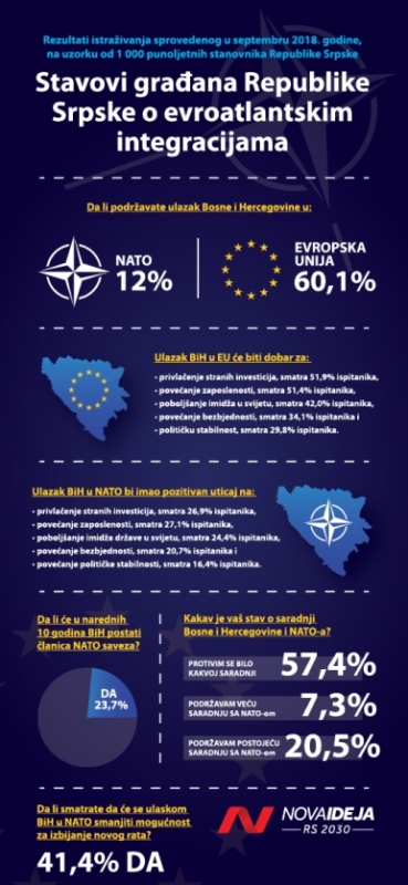 Istraživanja su pokazala i da ulazak u EU podržava 60,1% stanovnika Republike Srpske, a u NATO 12,0%.