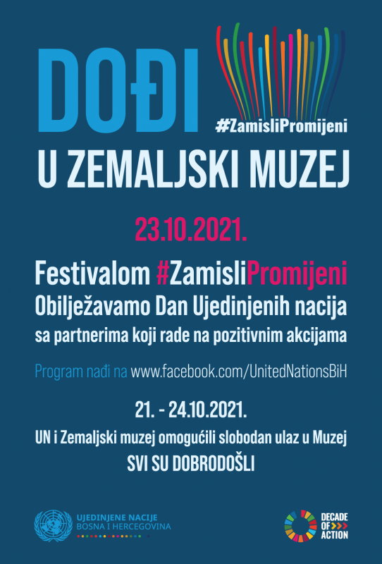 Upravo na ovim ciljevima, zajedno sa partnerima i uprkos panedimiji, rade Ujedinjene nacije u Bosni i Hercegovini. Ove godine navršava se 76. godina od osnivanja UN-a, a u Bosni i Hercegovini svoj dan Ujedinjene nacije obilježavaju festivalom #ZamisliPromijeni koji će biti realizovan u subotu 23. oktobra, od 13 do 18 sati, u botaničkoj bašti Zemaljskog muzeja, na adresi Zmaja od Bosne 3, u Sarajevu.