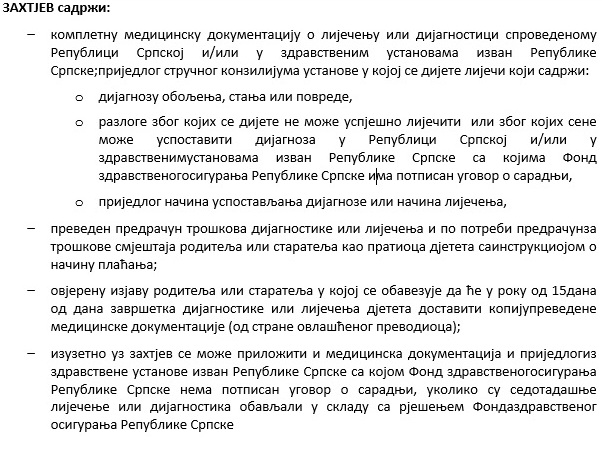 Између осталог, неопходан је и предрачун трошкова лијечења здравствене установе у којој се дијете упућује као и предрачун трошкова смјештаја за родитеља или старатеља преведени на један од три службена језика у БиХ, овјерена изјава родитеља (образац изјаве је доступан на интернет страници) да ће у року од 15 дана од завршетка лијечења или спроведене дијагностике доставити неопходну медицинску документацију, такође, преведену на један од три службена језика БиХ.