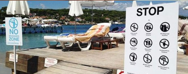 Na plaži su istaknuta upozorenja – velike table sa znakovima na kojima piše "#holidayspam". Plaža je proglašena zonom bez hvalisanja.