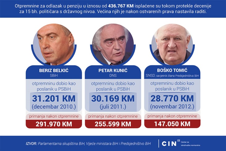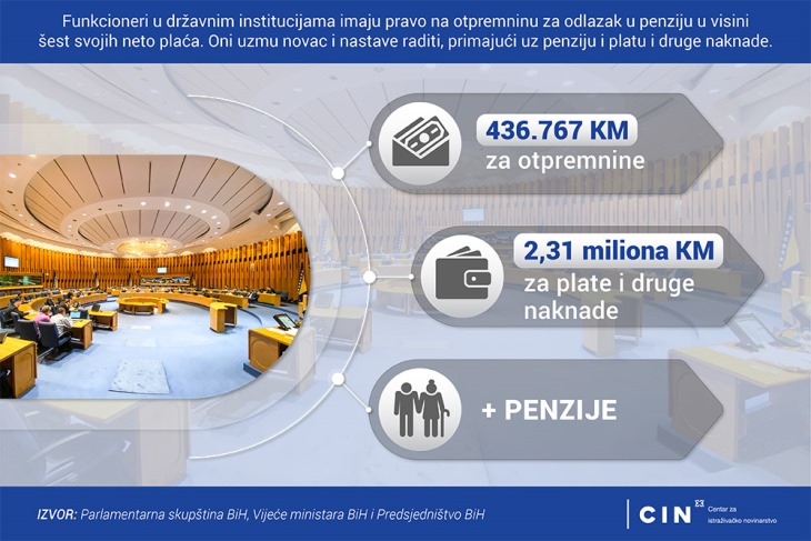 Za 15 funkcionera Parlamenta, Savjeta ministara i Predsjedništva BiH isplaćeno je 436.767 KM za otpremnine od početka 2010. do kraja marta 2021. godine. Većina njih je nakon toga ostala na funkcijama te uz penziju prima i platu.