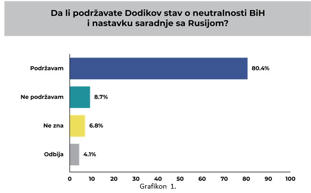 Najveći procenat stanovnika Republike Srpske (80,4%) podržava Dodikov stav o neutralnosti BiH i nastavku saradnje sa Rusijom. Ovome se protivi 8,7% građana, a 10,9% je odgovorilo „ne zna“ i „odbija“.