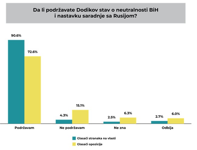 Najveći procenat glasača opozicije (SDS, PDP, DNS i Za pravdu i red) u Republici Srpskoj podržavaju Dodikov stav o neutralnosti BiH i nastavku saradnje sa Rusijom (72,6%), dok 15,1% ne podržava nastavak saradnje. Istovremeno, Dodikov stav o neutralnosi BiH podržava 90,6% glasača vlasti (SNSD, NDP, DEMOS, Socijalistička partija, Ujedinjena Srpska), a neutralnost ne podržava njih 4,3%.