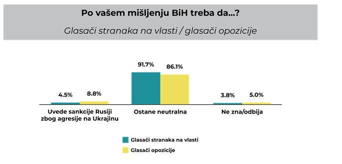 Istovremeno neutralnost BiH podržava 91,7% glasača vlasti (SNSD, NDP, DEMOS, Socijalistička partija, Ujedinjena Srpska), a sankcije bi podržalo njih 4,5%.
