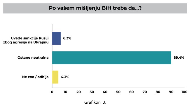 Najveći procenat stanovnika Republike Srpske (89,4%) smatra da Bosna i Hercegovina treba da ostane neutralna kada se radi o uvođenju sankcija Rusiji zbog agresije na Ukrajinu. Za uvođenje sankcija je 6,3% ispitanika, dok je 4,3% odbilo da ogovori.