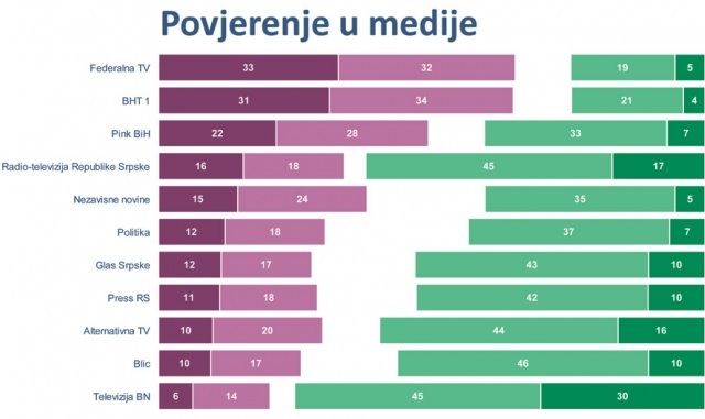 Što se tiče medija iz FBiH, 33 odsto ispitanika uopšte nema povjerenje u te medije. Prema ovom istraživanju, 32 odsto ispitanika uglavnom nema povjerenja u FTV, a sličan rezultat istraživanja je i kada je u pitanju BHTV jer u informacije te medijske kuće 31 odsto ispitanika uopšte nema povjerenja, dok 34 odsto uglavnom nema povjerenja, a samo je četiri odsto onih koji u potpunosti vjeruju ovom javnom servisu, pokazali su rezultati "Ipsos" istraživanja.