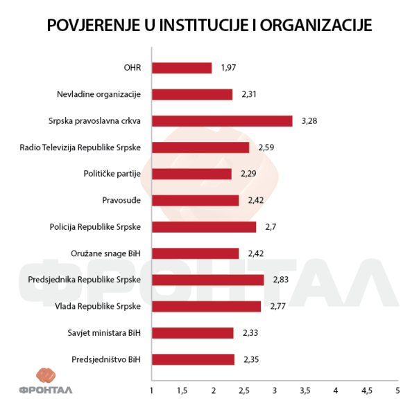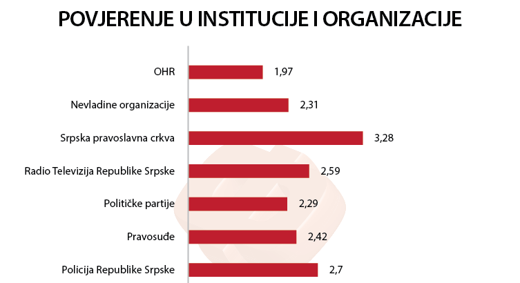 Stanovnici Republike Srpske najviše vjeruju Srpskoj pravoslavnoj crkvi (3,28 ), a potom predsjedniku Republike Srpske (2,83), Vladi Republike Srpske (2,77) i policiji Republike Srpske (2,7). Najmanje se vjeruje OHR-u (1,97), političkim partijama (2,29) i nevladinim organizacijama (2,31).