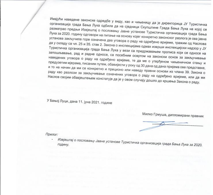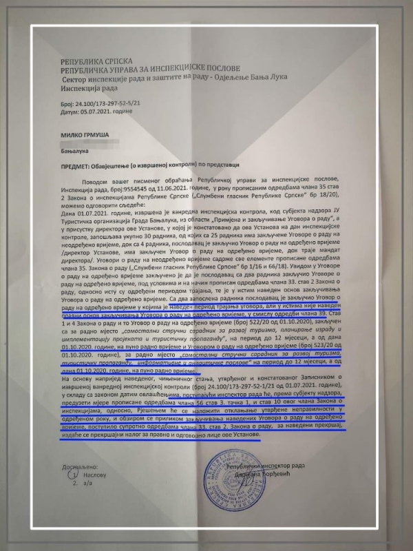 Данас сам добио од поступајућег инспектора рада званично обавјештење у којем је јасно и недвосмислено наведено да та два уговора о раду на одређено вријеме НИСУ ЗАКОНИТА, као и да ће се због незаконитог поступања ТОБЛ-у и директорици ТОБЛ-а издати ПРЕКРШАЈНИ НАЛОГ.
