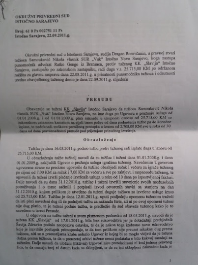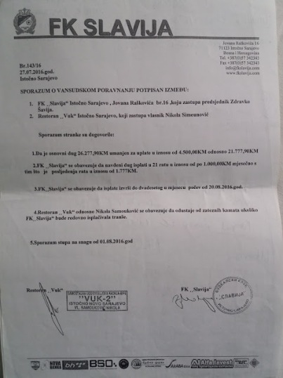 ”Nešto sam naplatio. Od KK Slavija po rješenju o dosudbi zaplijenjenih koševa i semafora naplaćen je iznos od 9.850 KM, a FK Slavija mi je na rate platio oko 8.000 KM. Dragan Kulina (jedan od predsjednika FK Slavija) mi je garantovao da će sve biti plaćeno, ali te garancije nije ispoštovao. Sa Zdravkom Šavijom, takođe predsjednikom FK Slavija, 27.07.2016. godine napravio sam sporazum da se plaća na mjesečnom nivou po 1.000 KM, te da se na taj način izmire dugovanja, međutim Ljubiša Ćosić načelnik opštine Istočno Novo Sarajevo to nije dozvolio. U ovoj varijanti ja sam bio spreman da ih osobodim kamate ako budu redovno izmirivali ove obaveze, ali oni to nisu ispoštovali.”