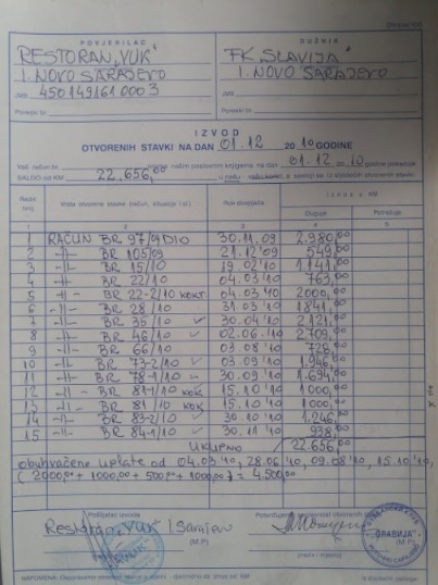 Dugovanja FK Slavija prema Nikoli Samoukoviću potvrđuje i Izvod otvorenih stavki od 01.12.2010. godine, potpisan od strane tadašnjeg čelnika kluba Milorada Košarca.