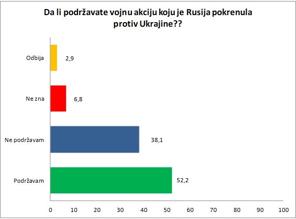Rusku vojnu akciju protiv Ukrajine podržava polovina stanovnika Republike Srpske, dok joj se protivi 38,1% njenih stanovnika. Na ovo pitanje nije odgovorilo 9,7% ispitanika.