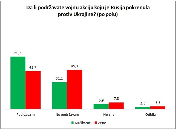 Muškarci u Republici Srpskoj (60,5%) više podržavaju rusku vojnu akciju protiv Ukrajine od žena (43,7%).
