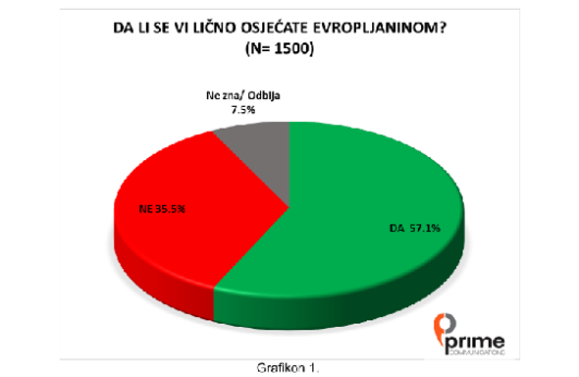 Evropljaninom se osjeća 57,1% građana Bosne i Hercegovine, dok se 5,5% sebe ne vidi tako. Neodlučnih je 7,5% stanovnika ove zemlje.