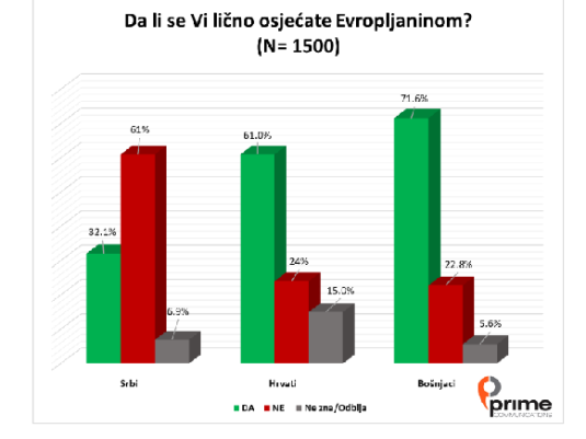 Sebe kao Evropljanina vidi 71,6% Bošnjaka, 61% Hrvata i 32,1% Srba. Sebe ne vide kao Evropljanina 61% Srba, 24% Hrvata i 22,8% Bošnjaka.
