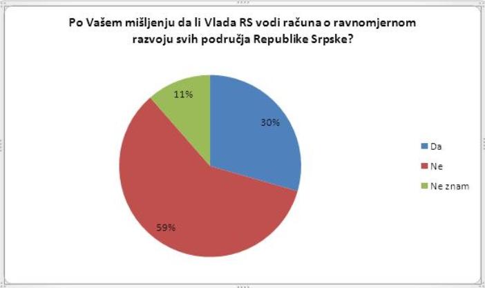 Najveći broj građana Republike Srpske (59%) smatra da Vlada ne vodi dovoljno računa o ravnomjernom razvoju ovog entiteta, dok 30% smtra da je taj razvoj ravnomjeran.