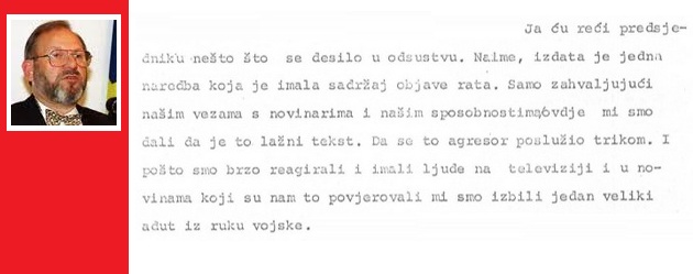 Naime, izdata je jedna naredba koja je imala sadržaj objave rata. Samo zahvaljujući našim vezama s novinarima i našim sposobnostima ovdje, mi smo dali da je to lažni tekst. Da se to agresor poslužio trikom. I pošto smo brzo reagirali i imali ljude na televiziji i u novinama koji su nam povjerovali, mi smo izbili jedan veliki adut iz ruku vojske