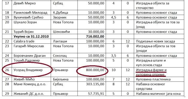 Predsjedniku Udruženja poljoprivrednih proizvođača i mljekara Republike Srpske Vladimiru Usorcu iz posebnog „Fonda Partner“ Ministarstva poljoprivrede, šumarstva i vodoprivrede Republike Srpske, odobreno je 800.00 KM, što je ubjedljivo najveći kredit u odnosu na svih 77 drugih poljoprivrednika koji su dobili u prosjeku od 10.000 do 100.000 KM.