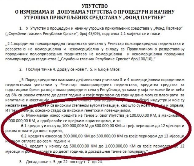 Maksimalan limit za kredit Fonda Partner godinama je bio 100.000 KM. Međutim, neposredno prije zahtjeva koji je podnio Usorac, ministri poljoprivrede i finansija, uz saglasnosti Vlada Srpske povećali su limit pojedinačnog zaduživanja sa 100.000 na 1.000.000 KM, a rok otplate sa pet na 10 godina. (Prilog: Prvo Uputstvo o korišćenju sredstava Fonda Parner 2009. , Odluka o povećanju limita)