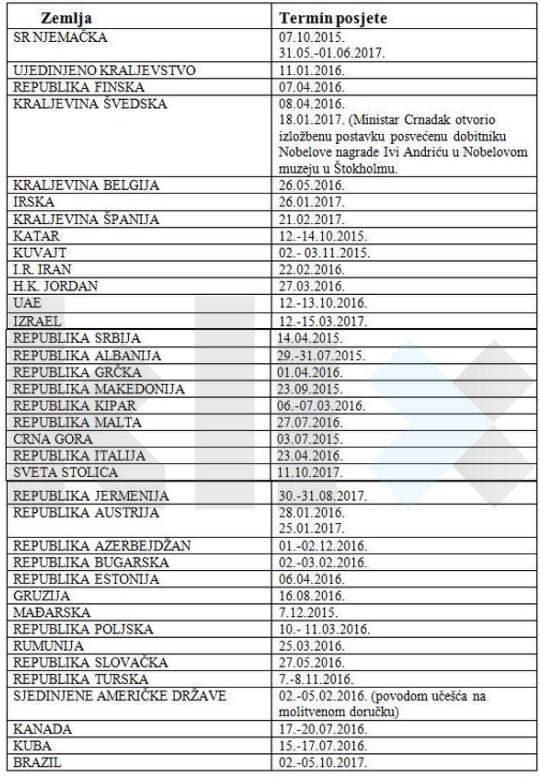 Tako je Crnadak o trošku države boravio u Njemačkoj, Ujedinjenom Kraljevstvu, Finskoj, Švedskoj, Belgiji, Irskoj, Španiji, Kataru, Kuvajtu, Iranu, Jordanu, Ujedinjenim Arapskim Emiratima, Izraelu, Srbiji, Albaniji, Grčkoj, Makedoniji, Kipru, Malti, Crnoj Gori, Italiji, Vatikanu, Jermeniji, Austriji, Azerbejdžanu, Bugarskoj, Estoniji, Gruziji, Mađarskoj, Poljskoj, Rumuniji, Slovačkoj, Sjedinjenim Američkim Državama, Kanadi, Kubi i Brazilu.