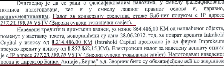 „.…Navedeni krediti i premljeni avansi, uz iznos od 846,468 KM od naplaćenog objekta, pomenut u nastavku teksta, iskorišćeni su dana 28.06.2012. godine za povrat kredita Intrahold Capital u iznos od 8.214.486 KM. Elektronski nalog za navedenu isplatu stigao je sa IP adrese 217.23.199.10 VSTS. Nalogodavac navedenog posla je direktor Banke…“, navodi se u Izvještaju.