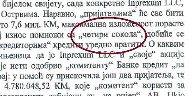„Zajedničko ulaganje im je bilo neophodno jer je Zakonom o bankama RS dozvoljena maksimalna kreditna izloženost prema jednom klijentu 40 odsto kapitala banke. U tom trenutku to je 18,9 miliona KM, što znači da je BIB „Balkaniki“ odobrila maksimalan iznos kredita od 7,6 miliona KM. Za preostali iznos kredita uskaču poslovni „prijatelji“ registrovani po poštanskim boksovima. „Prijateljima“ će uložena sredstva biti uredno vraćena kada BIB ojača i maksimalna izloženost poraste na 15,7 miliona KM. Kad se taj iznos pomnoži sa „četiri sokola“ (Inegra, Kvasko, Kapitalni projekti i Balkanika) dobiće se iznos od 62,8 miliona KM“, zapisala je direktorica Republičkog deviznog inspektorata Zorica Cvijanović.