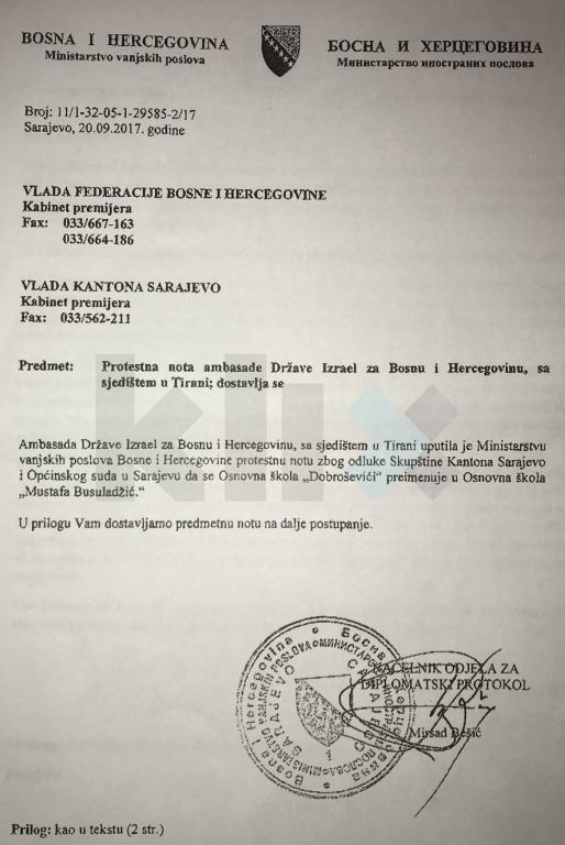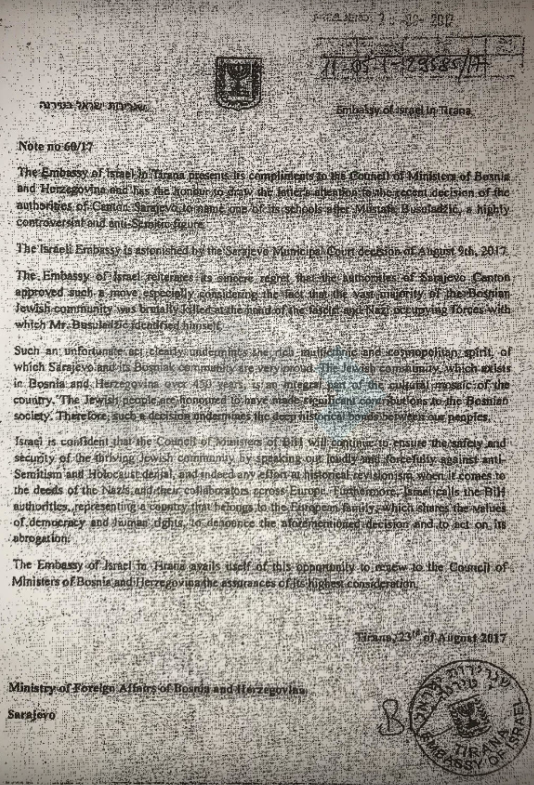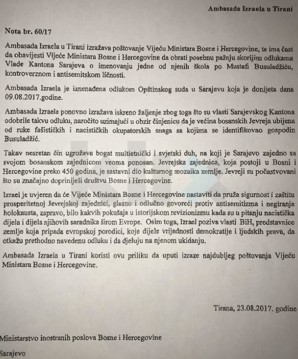 Izraelska ambasada direktno se obratila centralnoj vlasti, odnosno Savjetu ministara BiH, od kojeg traži da obrati posebnu pažnju na nedavnu odluku Vlade Kantona Sarajevo o imenovanju jedne od njenih škola po "kontroverznoj i antisemitskoj ličnosti" Mustafi Busuladžiću.