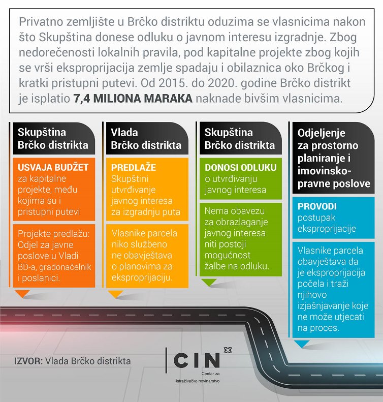 Prema Zakonu o eksproprijaciji nekretnina u Brčko distriktu, privatno zemljište se oduzima vlasnicima nakon što Skupština, na prijedlog Vlade, donese odluku da je gradnja u javnom interesu. Pritom Zakon nije obavezao institucije da obrazlože razloge za takvu odluku niti je građanima dozvoljeno žaliti se na nju. Uz to, nije propisano ni da vlasnik mora dati saglasnost za eksproprijaciju.