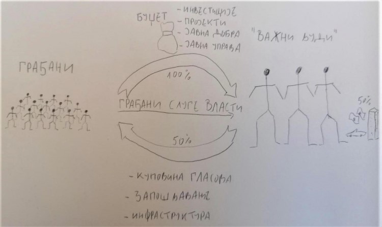 Онда користе те ресурсе, за које су осиромашили грађане, за куповину наклоности истих тих грађана, тиме легитимишући своја дјела. Такве друштвене односе сам илустровао на сљедећи начин: