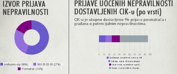 Ukupno je zaprimljeno 372 prijava od kojih je Koalicija utvrdila 96 slučajeva koja predstavljaju kršenje Izbornog zakona BiH.