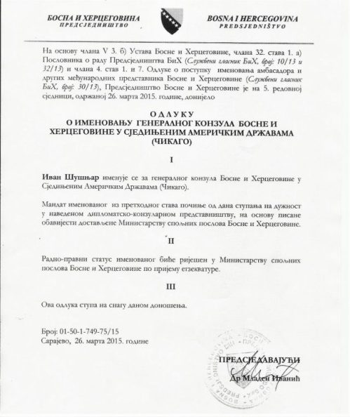 Foto: Faksimil Odluke o imenovanju Ivana Šušnjara za generalnog konzula, što su kasnije Amerikanci iz potpuno jasnih razloga osporili i odbacili