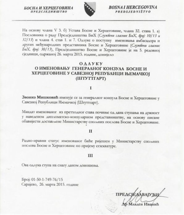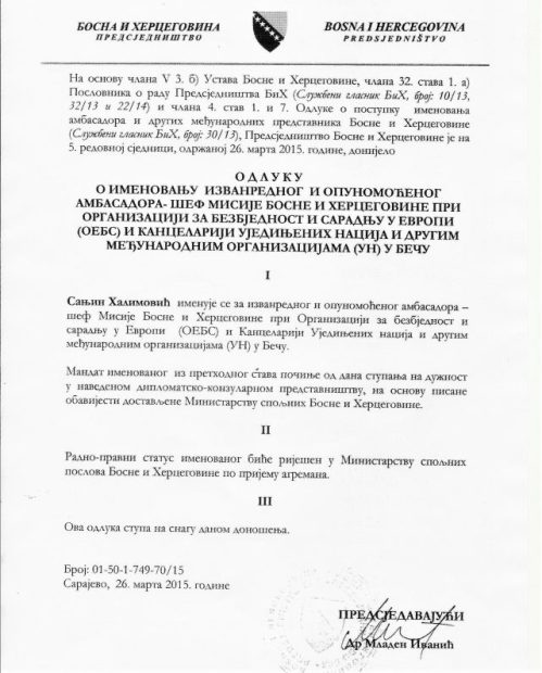 Foto: Faksimili odluka o imenovanju ljudi Bakira Izetbegovića na ambasadorske pozicije; Haris Lukovac je “služio” još Bakirovom ocu Aliji Izetbegoviću, a Sanjin Halimović je jedan od Izetbegovićevih najodanijih saradnika
